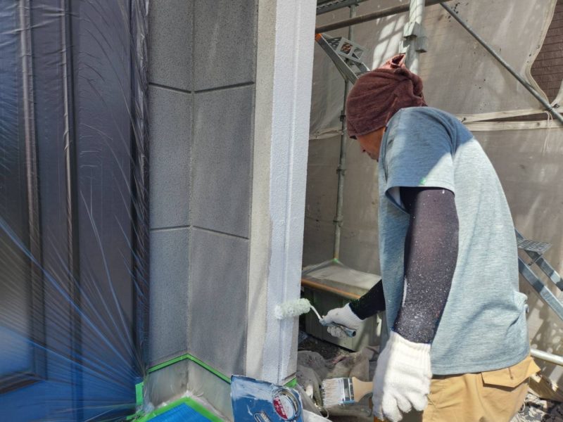 この材料は、外壁に発生している細かなヘアクラック(細いひび割れ)をしっかりと埋める効果があり、上塗り塗料の密着性を高める役割も果たします。仕上がりの美しさと耐久性を大きく左右する、とても重要な工程です。
