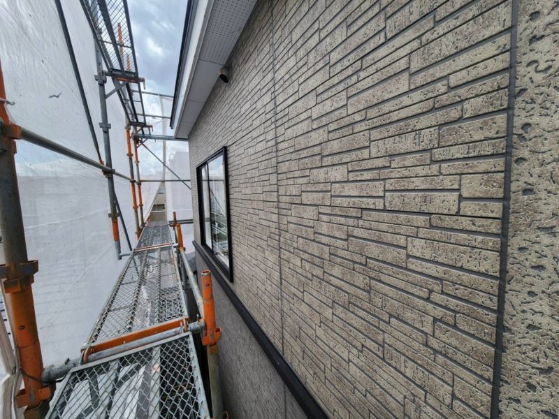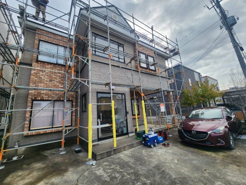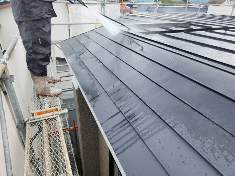 長年の汚れや劣化した旧塗膜をしっかりと洗い流し、次の塗装工程に向けて下地を整えています。