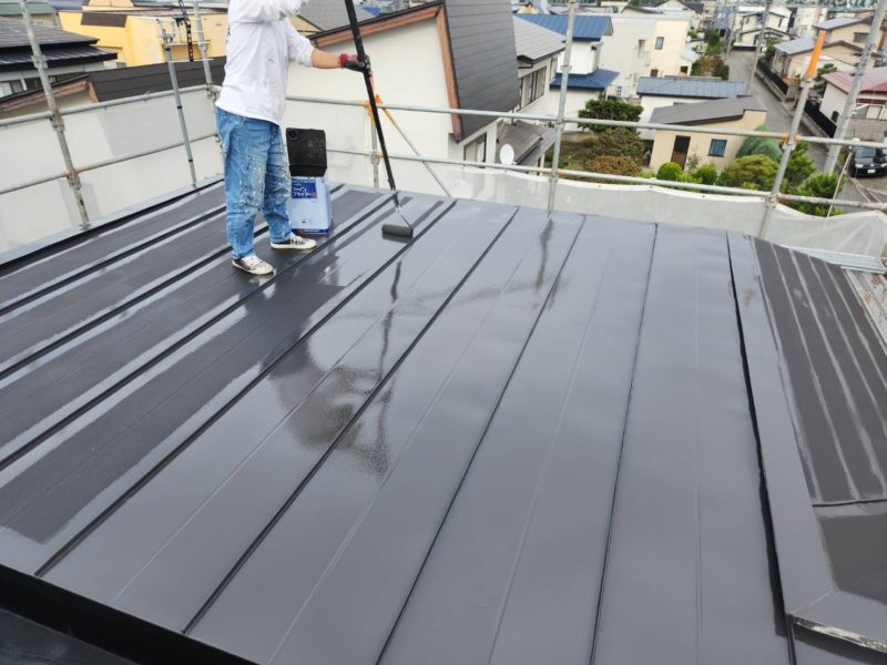 弘前市川先にて屋根上塗り1回目塗装