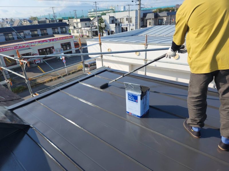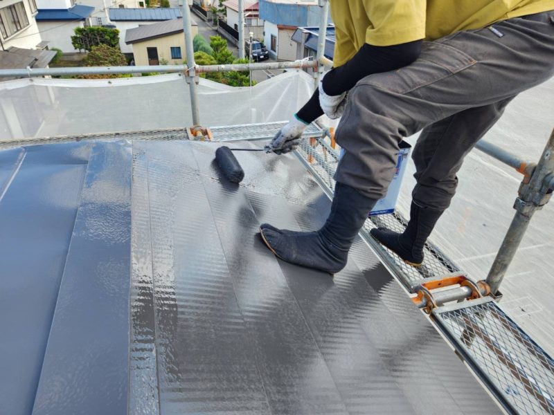 弘前市川先にて屋根塗装工事の上塗り2回目を施工しました。