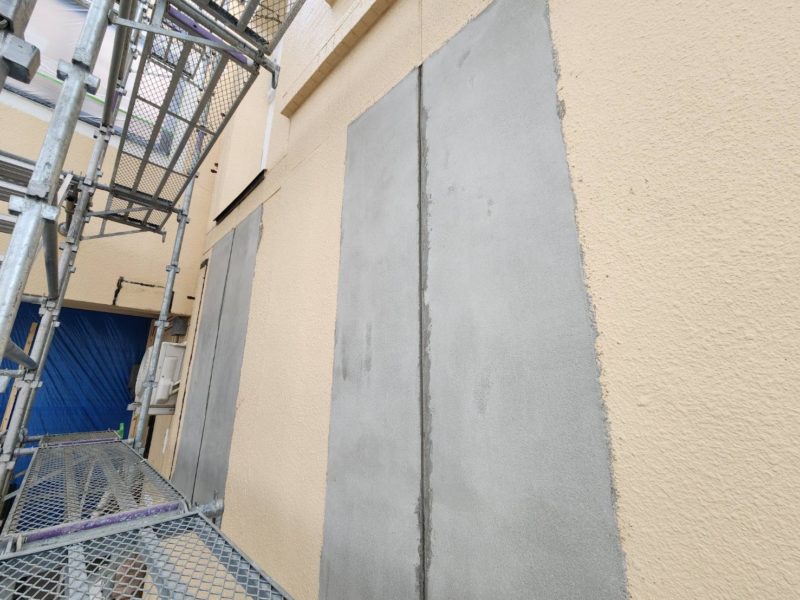 弘前市城東の改修工事現場にて、外壁にマスチックローラーを使用した模様付け施工を行いました。