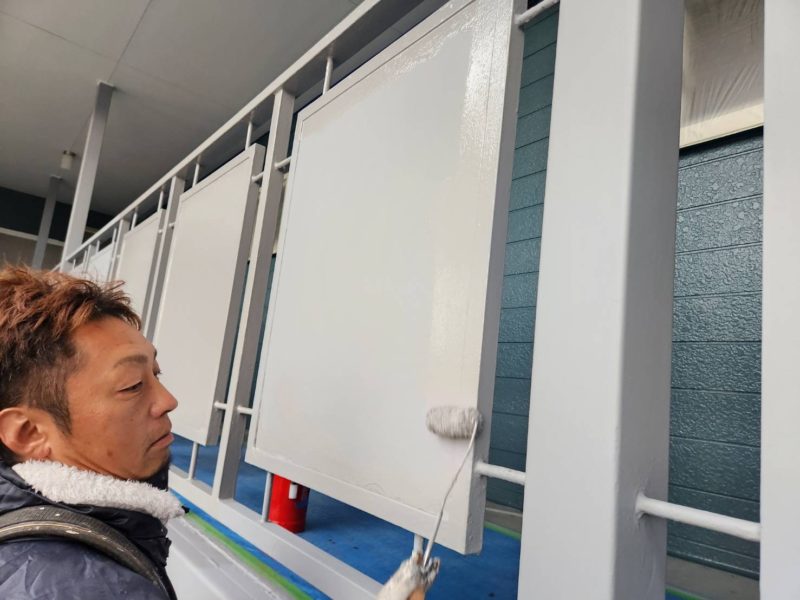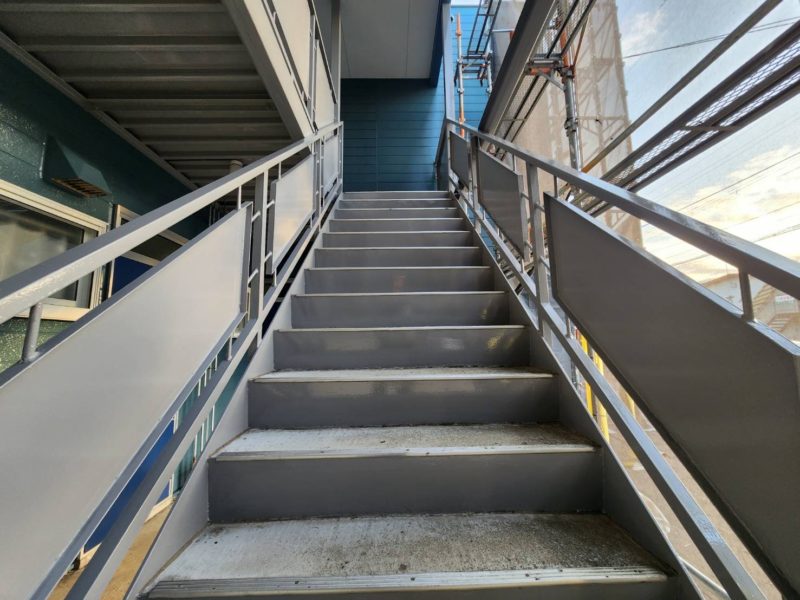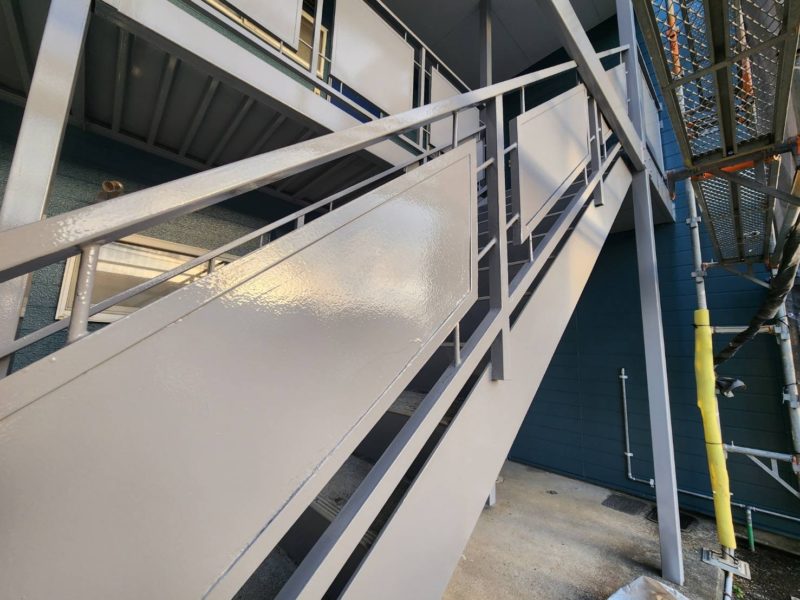 本日は、弘前市城東中央のアパートにて、鉄骨階段の上塗り塗装を行いました。