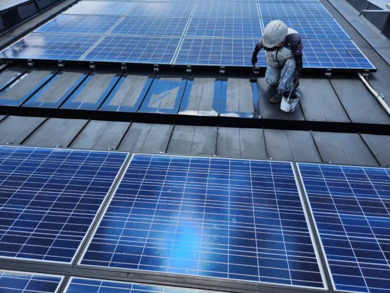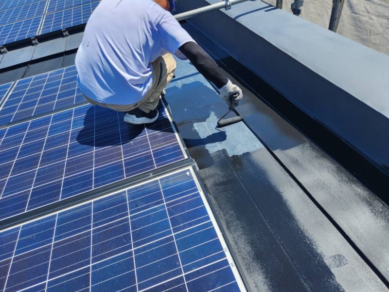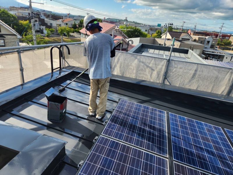 屋根は、下地処理後に防錆性能に優れた錆止め塗料を全体に均一に塗布。